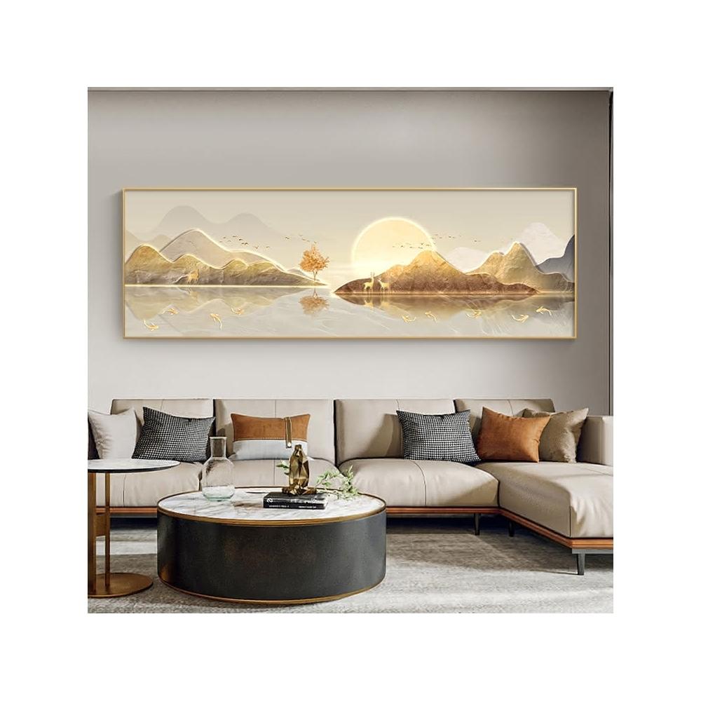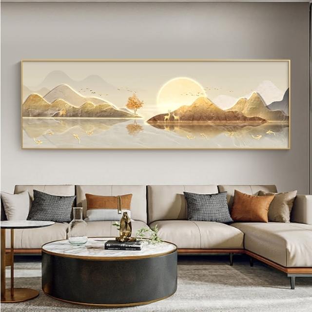 旭日東昇山水畫客廳裝飾畫 一整幅日出靠山壁畫 橫版沙發背景牆掛畫