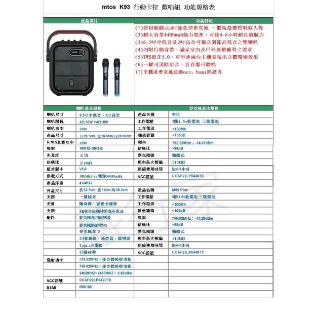 MTOmtos K93 卡拉OK 藍牙行動音箱 台灣原廠直售 無線麥克風 音響 藍牙喇叭 KTV