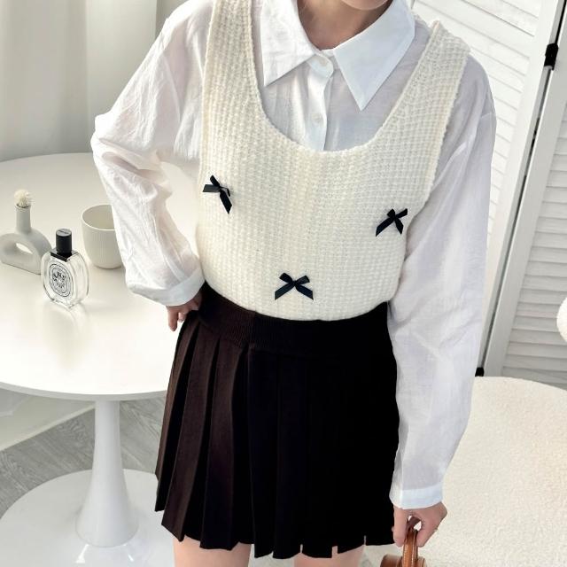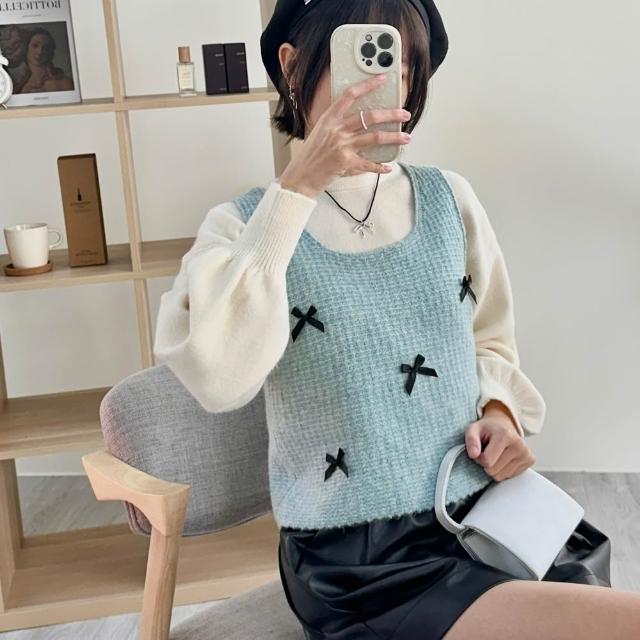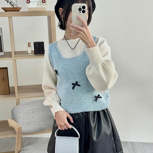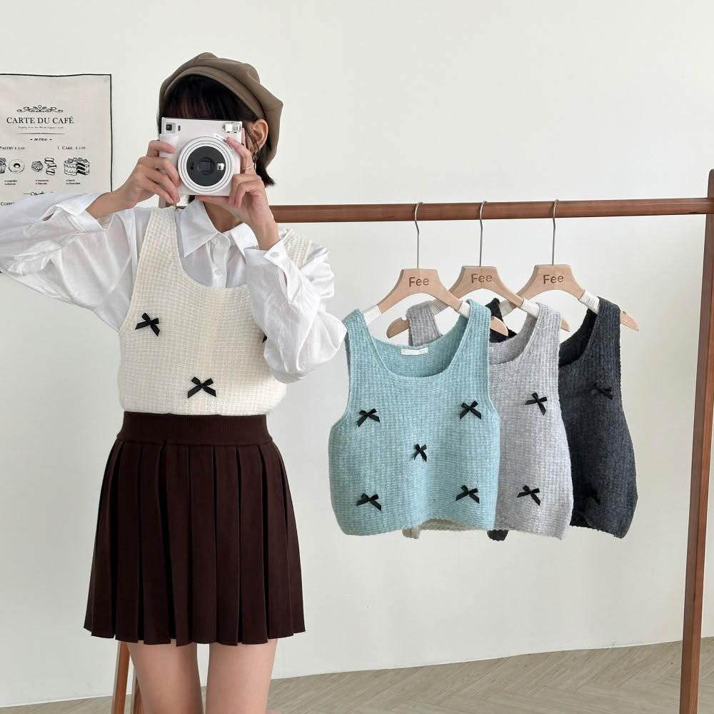 FEE BABY【Fee隔日到貨4色】立體蝴蝶結方領針織短版背心🔥針織背心 方領背心 針織衫 無袖背心 緞帶背心 疊穿背心 韓國 春天