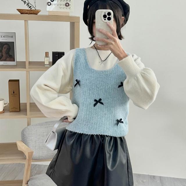 FEE BABY【Fee隔日到貨4色】立體蝴蝶結方領針織短版背心🔥針織背心 方領背心 針織衫 無袖背心 緞帶背心 疊穿背心 韓國 春天