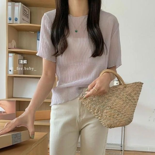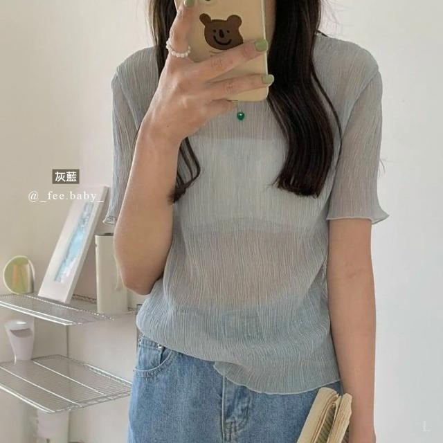 FEE BABY【Fee爆款10色】韓系木耳邊透膚上衣🔥杏色內搭 淺色打底 透視上衣 短袖 皺皺雪紡 網紗透膚 疊穿 韓系 春天穿搭