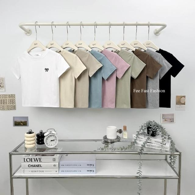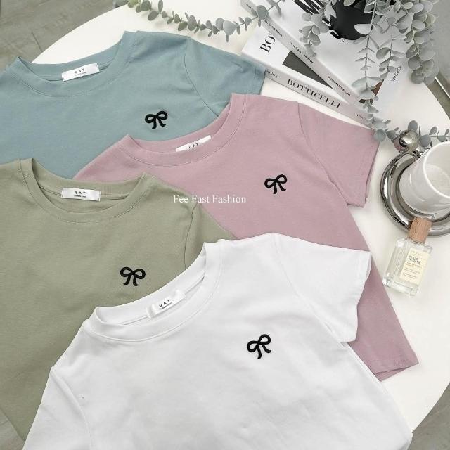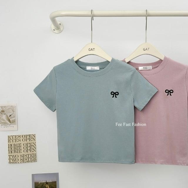 FEE BABY【Fee現貨9色】正韓刺繡蝴蝶結短版上衣🔥彈力 短版上衣 素T 棉T 圓領 女上衣 短袖 素色 蝴蝶結 GAT 韓國