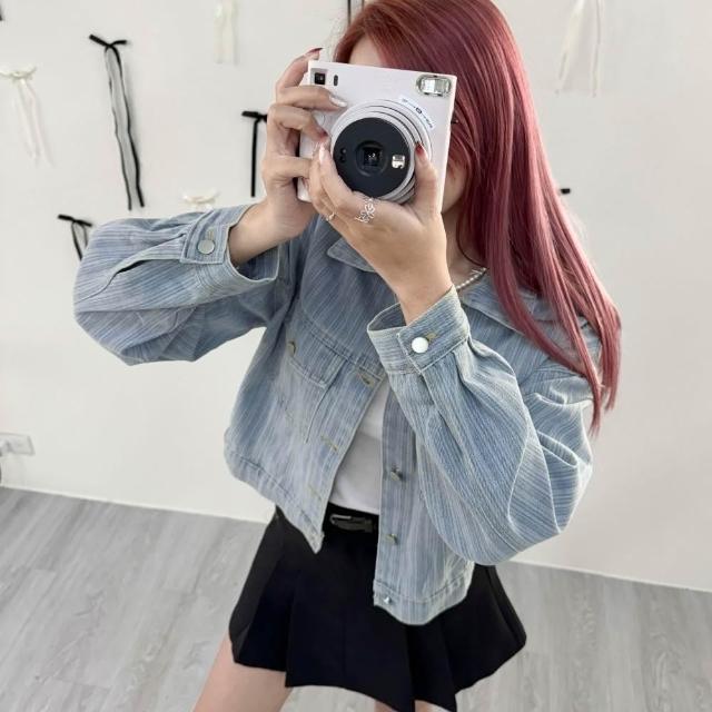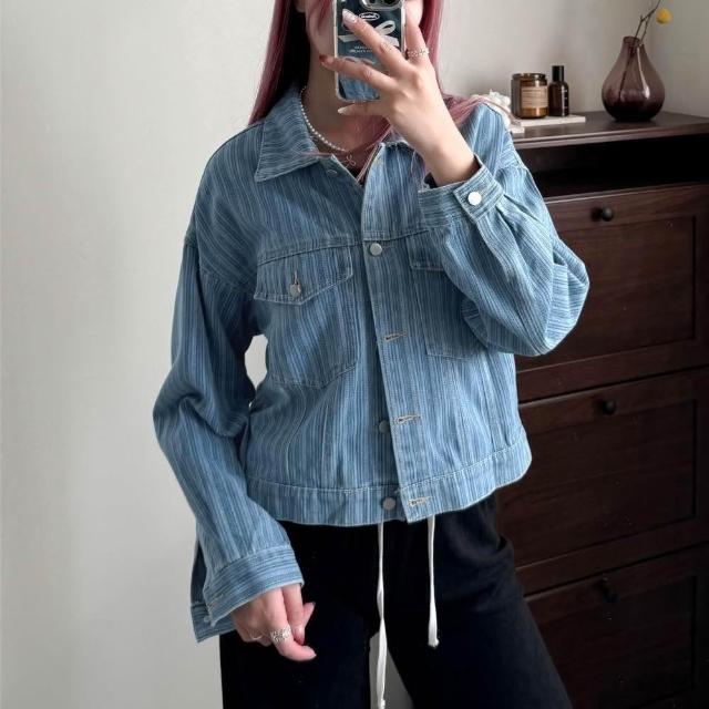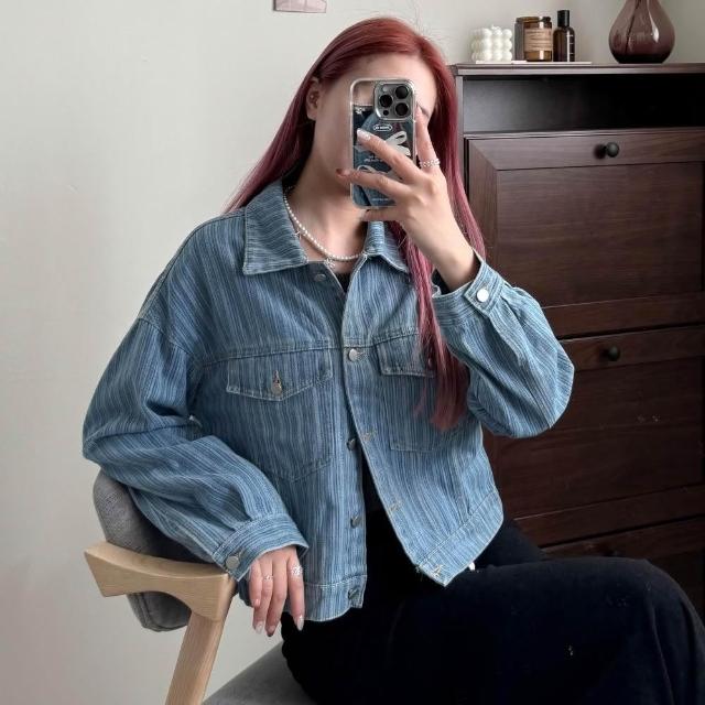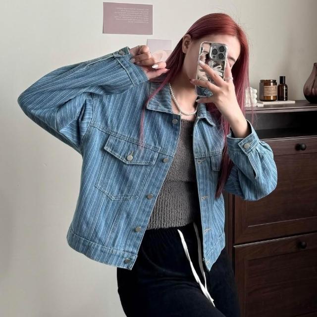 FEE BABY【Fee隔日到貨】直紋丹寧翻領短夾克🔥外套 牛仔外套 短版外套 牛仔 日系外套 小外套 夾克 條紋 設計感外套 女外套