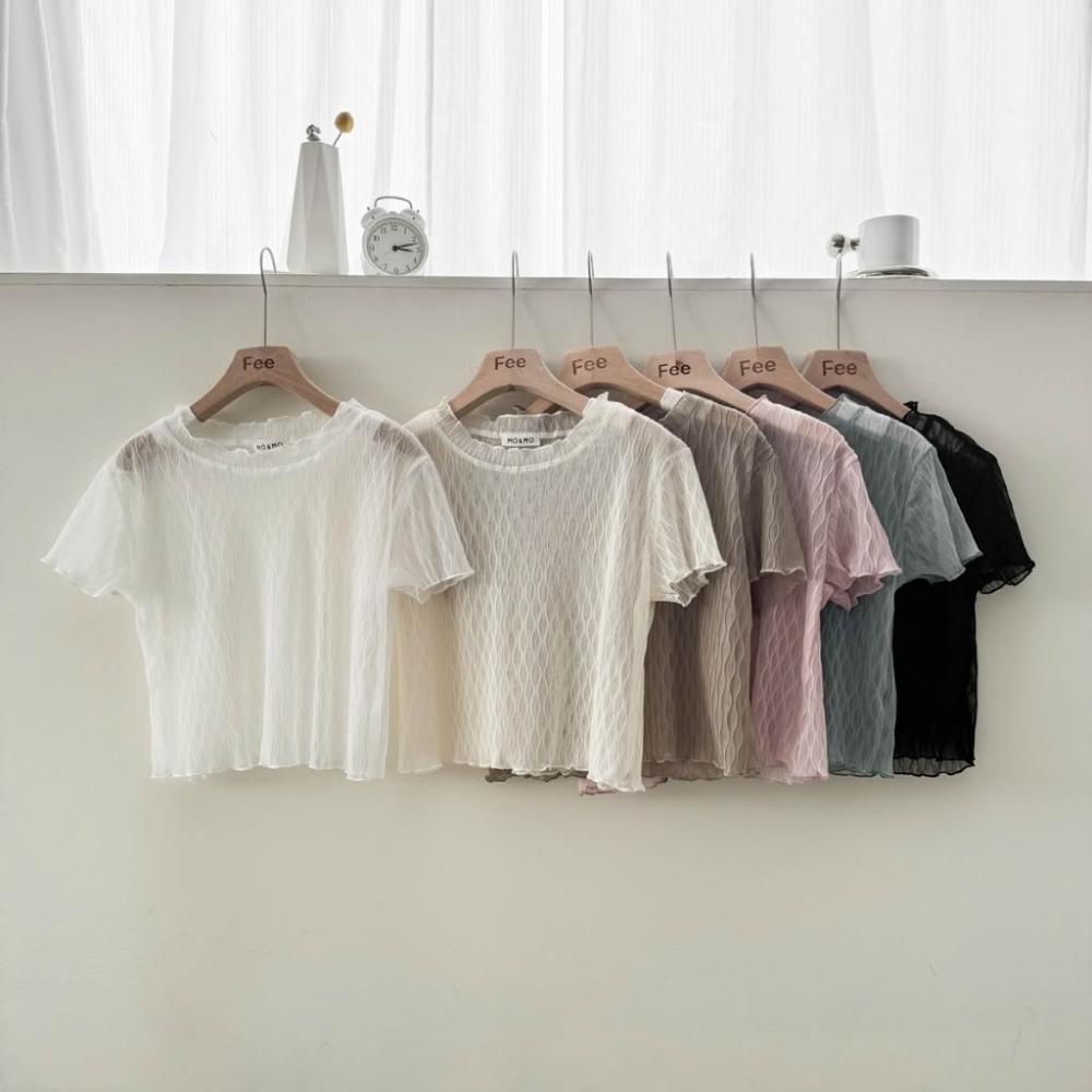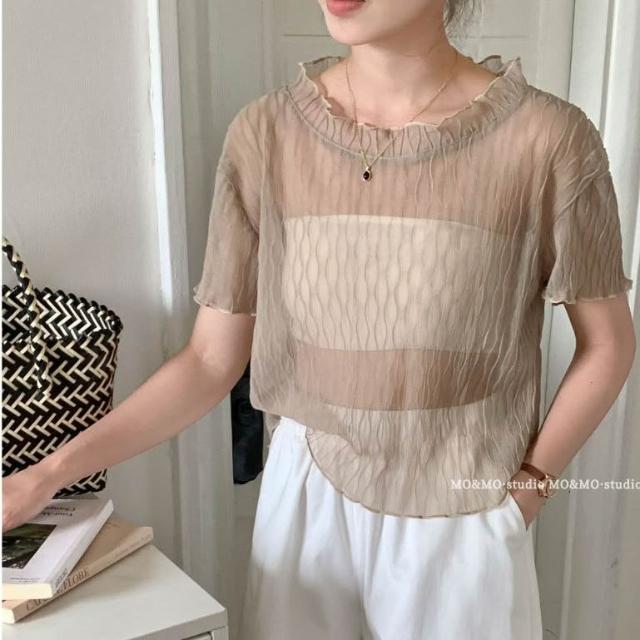 Fee現貨6色捲邊小立領透膚短袖上衣🔥微捲邊網紗透膚短袖 內搭網紗上衣 捲邊透膚T恤 木耳邊短版T