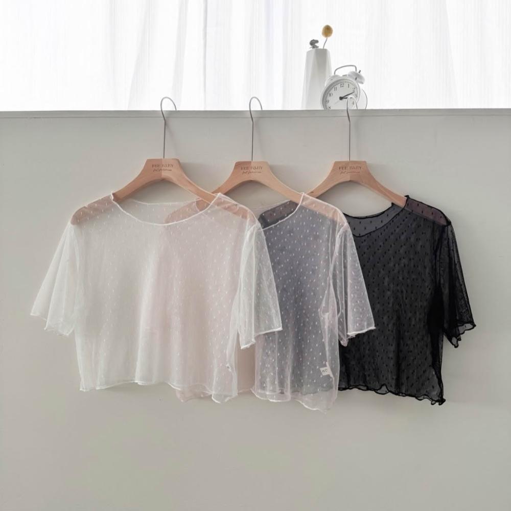 FEE BABY【Fee隔日到貨4色】雨滴點點網紗透膚短袖T恤🔥微捲邊圓點短袖上衣 內搭網紗上衣 捲邊透膚T恤 木耳邊短版T 輕薄上衣