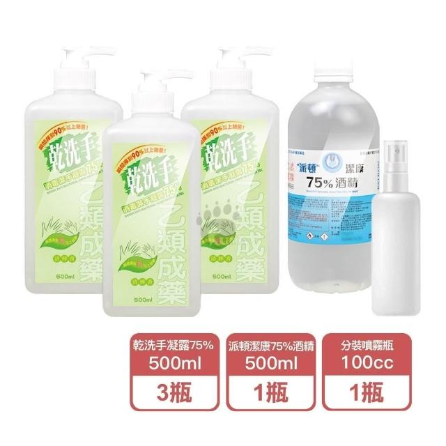 中化健康生技中化 乾洗手消毒潔手凝露75%(檸檬清香味)500mlX3瓶+派頓潔康酒精75%X1瓶+100cc酒精分裝噴霧瓶