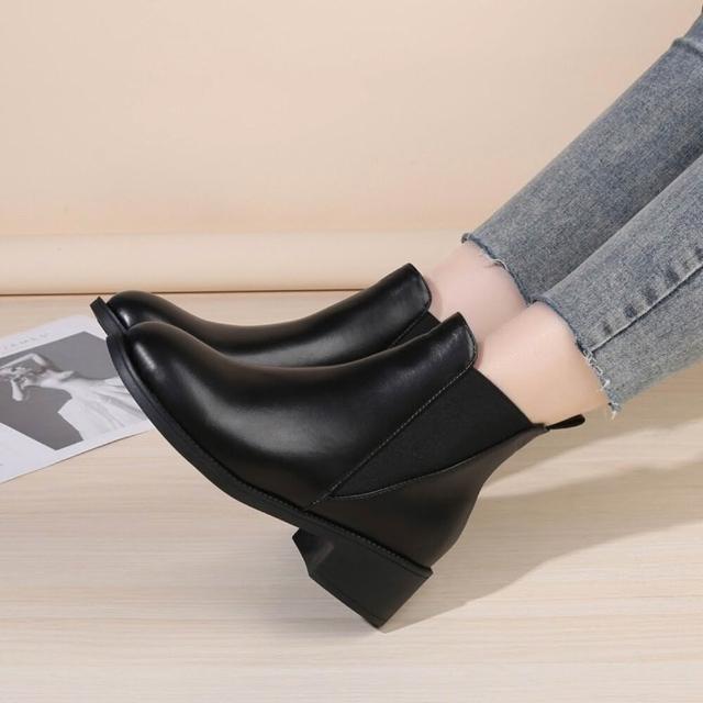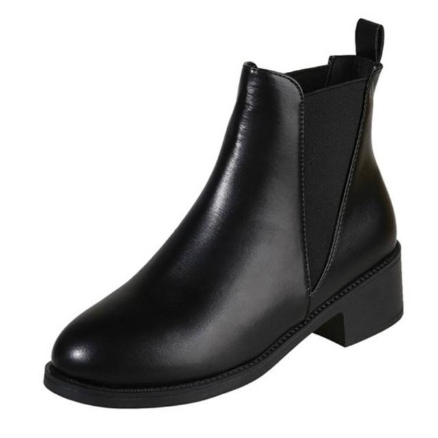 皮面圓頭短靴 低跟 踝靴 黑色 伸縮帶好穿脫