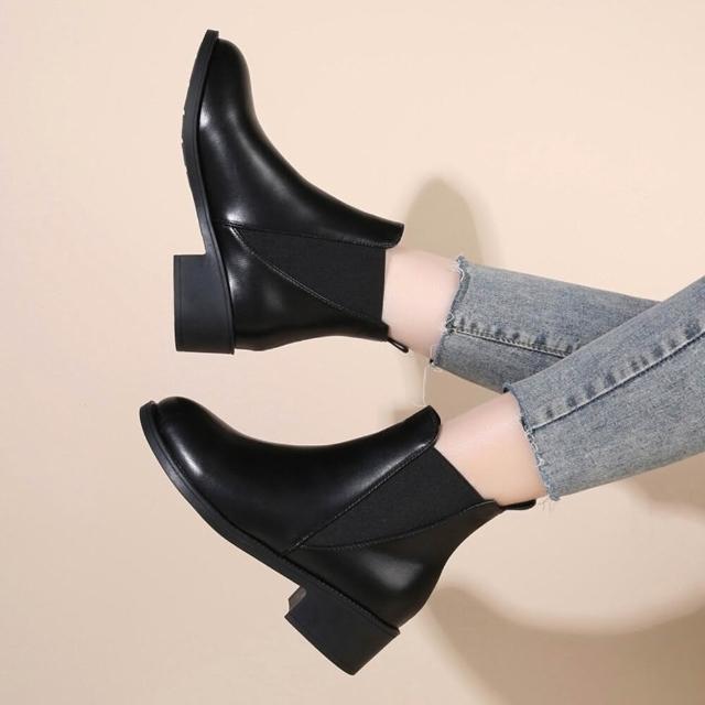 皮面圓頭短靴 低跟 踝靴 黑色 伸縮帶好穿脫