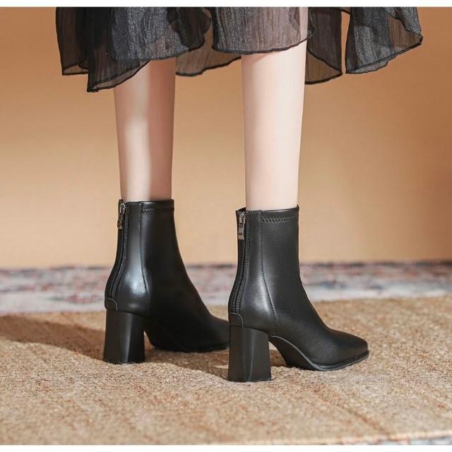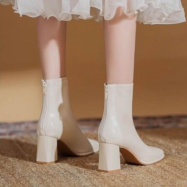 皮面短靴 中筒靴 女靴子 高跟 低跟 粗根 米白色 黑色 杏色