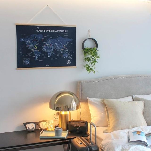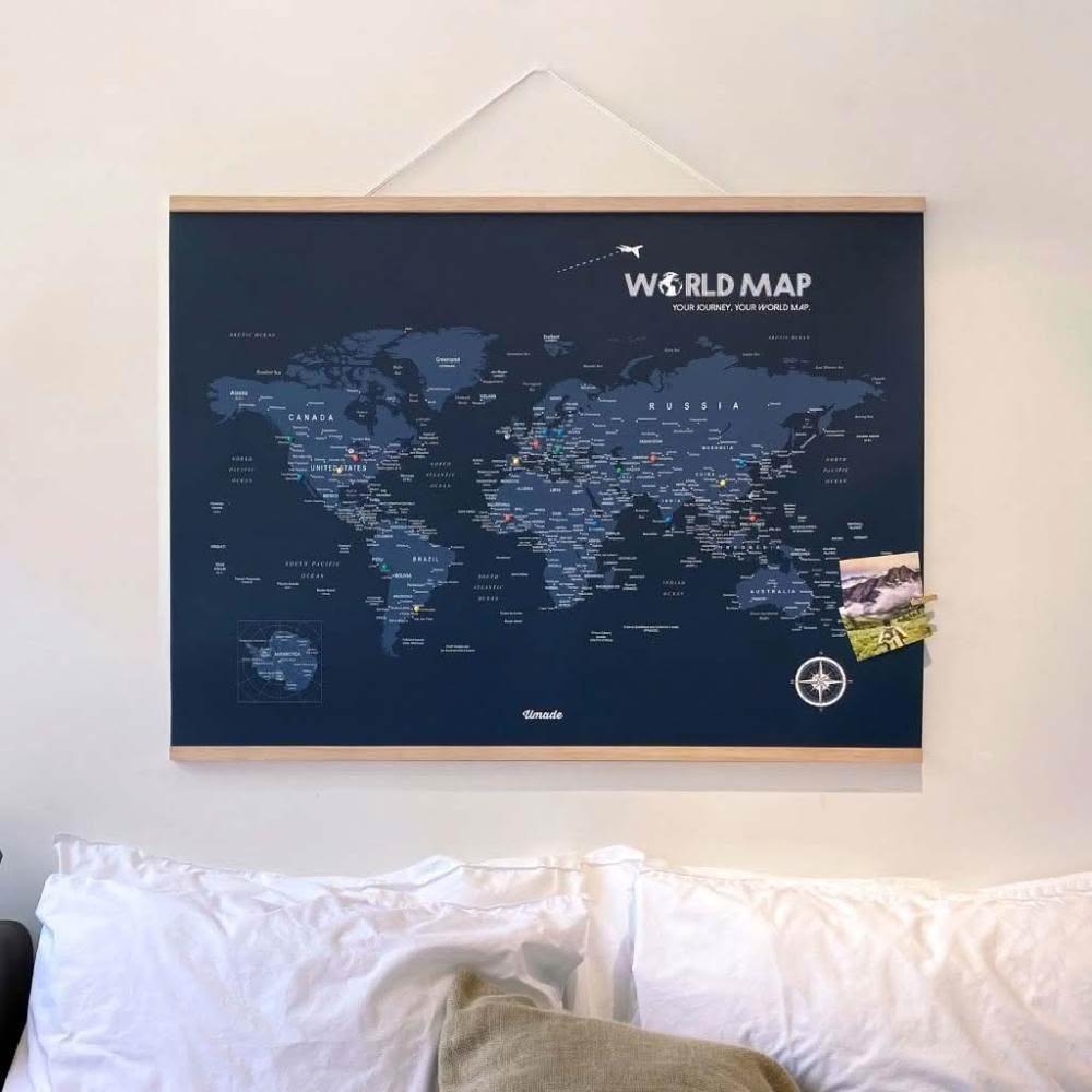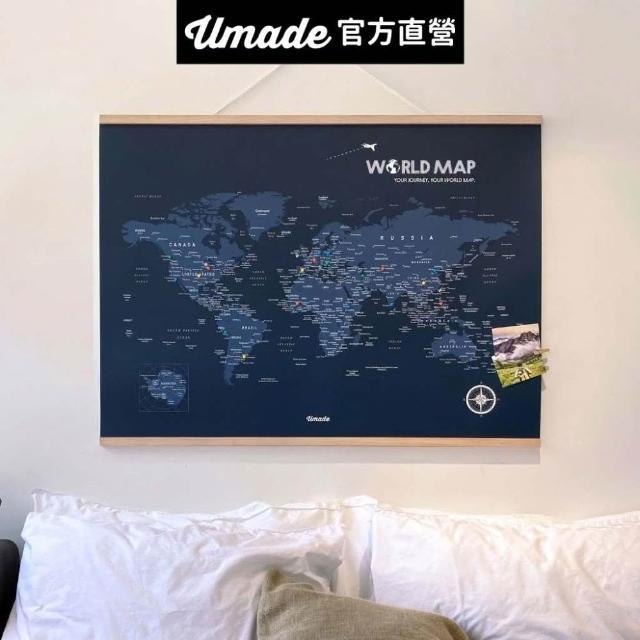 Umade世界地圖木框海報 海軍藍色 小/大 附磁鐵地標扣 (牆壁 房間 居家裝飾 客廳 書房佈置 旅行紀錄 情侶 生日禮物)