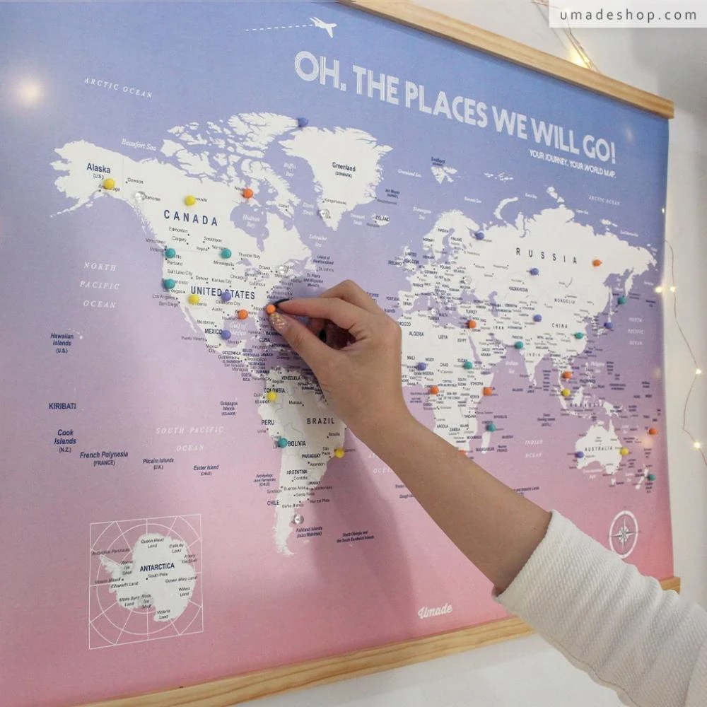 Umade世界地圖木框海報 輕柔粉色 附磁鐵地標扣 (房間佈置 居家情境裝飾 旅行紀念 環遊世界 女友禮物 生日禮物 送禮推薦)
