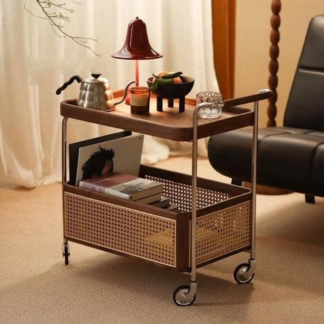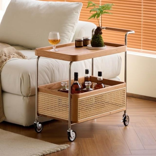廠家直銷✨免運 中古实木边几 可移动小户型高级藤编边几 客厅复古侘寂风沙发茶几 小推车