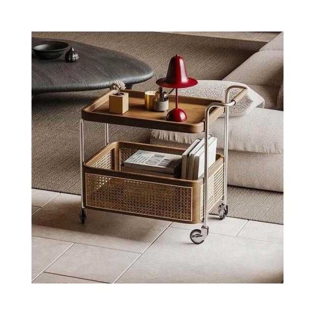 廠家直銷✨免運 中古实木边几 可移动小户型高级藤编边几 客厅复古侘寂风沙发茶几 小推车