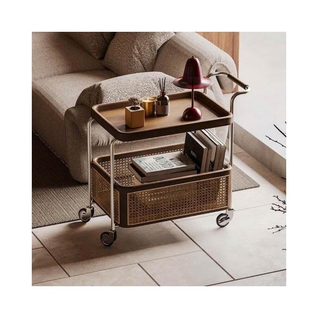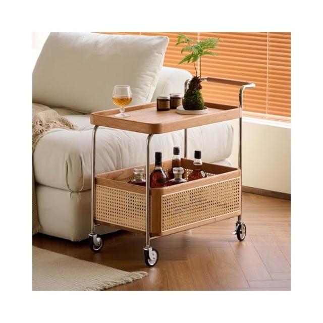 廠家直銷✨免運 中古实木边几 可移动小户型高级藤编边几 客厅复古侘寂风沙发茶几 小推车