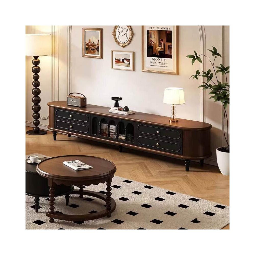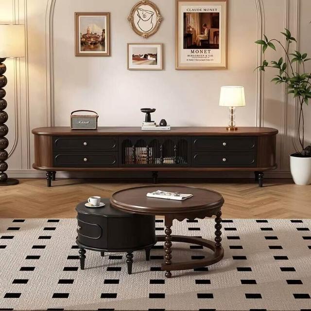 法式復古實木電視櫃胡桃黑色美式客廳電視機櫃茶幾組合儲物地櫃