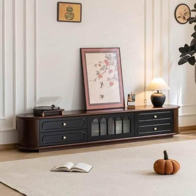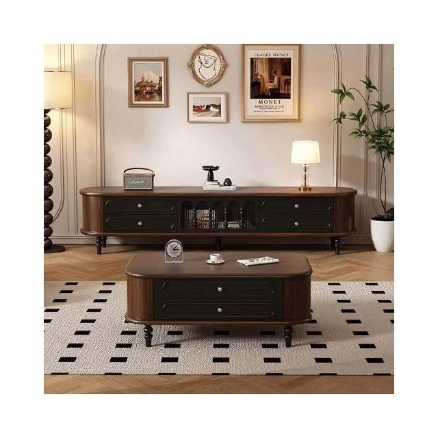 法式復古實木電視櫃胡桃黑色美式客廳電視機櫃茶幾組合儲物地櫃