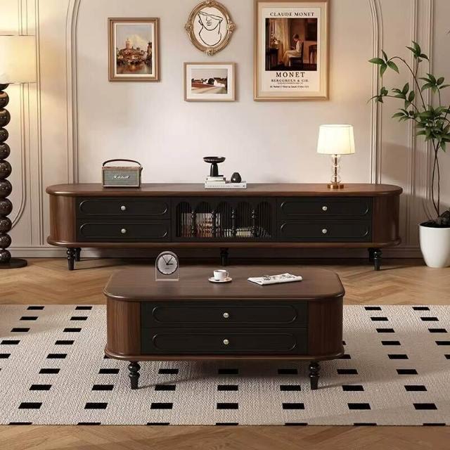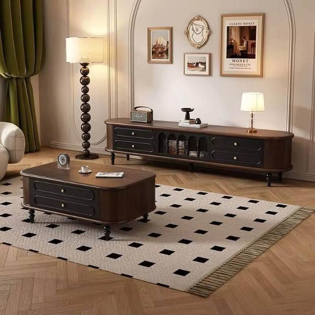 法式復古實木電視櫃胡桃黑色美式客廳電視機櫃茶幾組合儲物地櫃