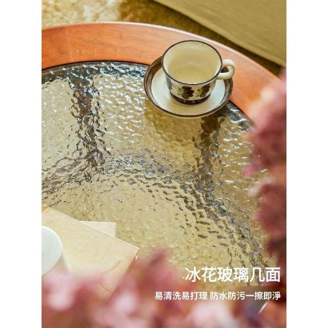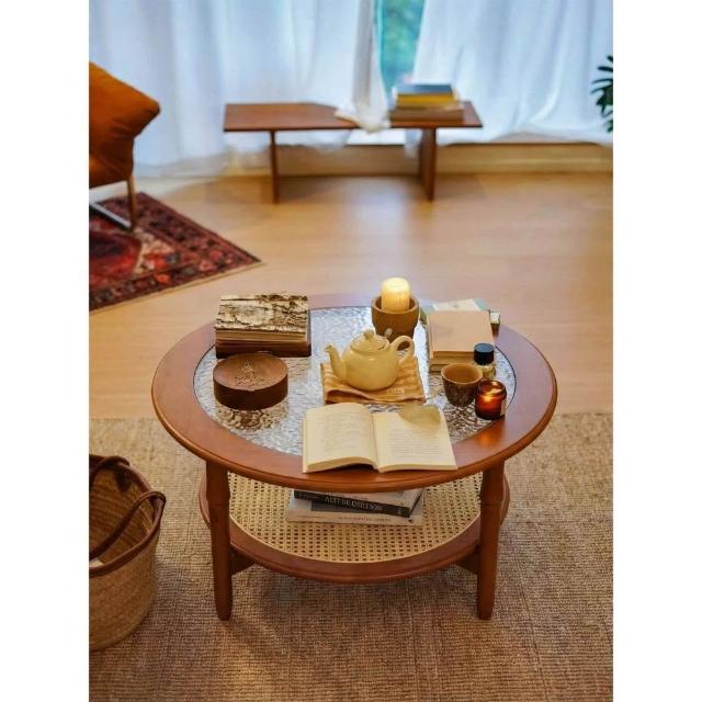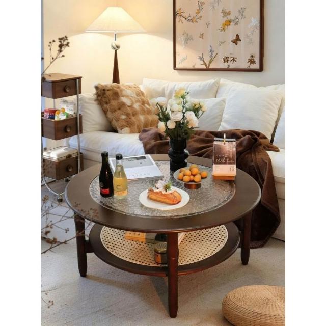 客廳家用原木風藤編茶幾小戶型法式中古實木矮茶桌子圓形玻璃復古