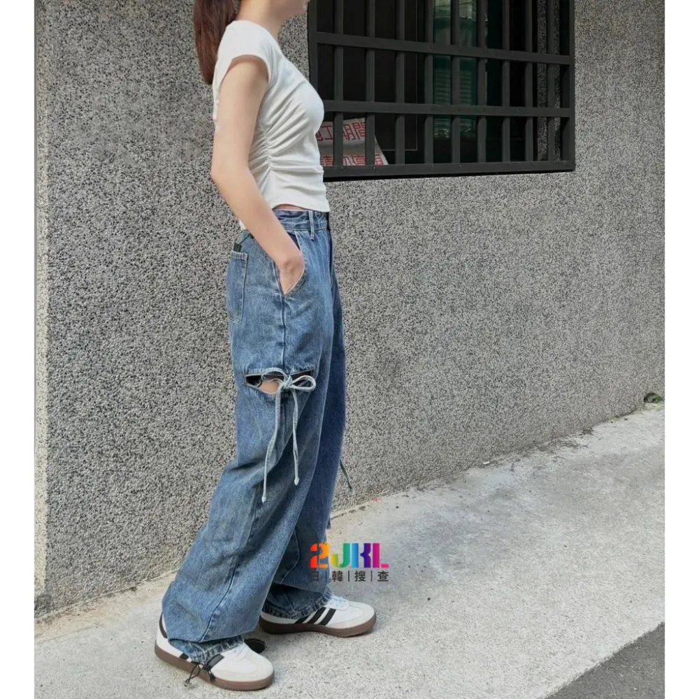 #L1602322 美式側簍空綁帶縮口牛仔工裝褲 甜酷辣高腰質感側邊蝴蝶結落地寬褲 時尚百搭顯瘦丹寧長褲