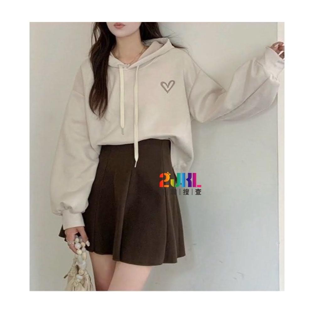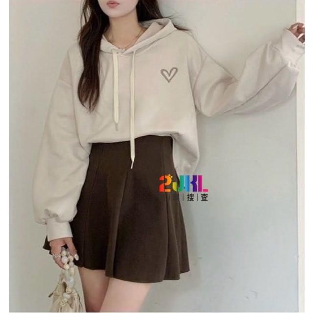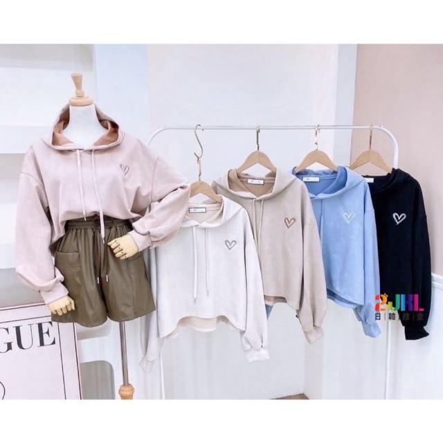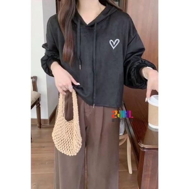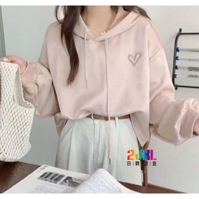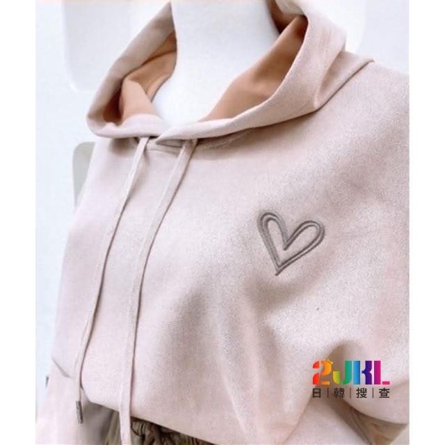 #L1710492 秋冬寬鬆舒適麂皮愛心刺繡燈籠袖連帽上衣 百搭素色長袖衛衣 質感百搭長袖衛衣帽T 簡約修身休閒顯瘦上衣