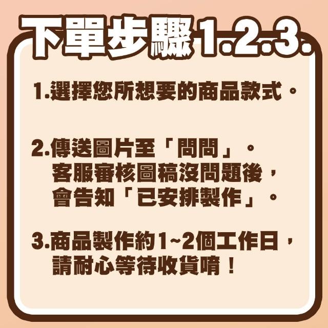- ☆ 客製化商品屬 「例外商品類別:消費者要求所為之客製化給付」,無法提供退換貨。 ☆ 客製化商品下單前請先詳閱商品內容及寄送方式,訂單成立即會安排製作,如果不了解下單方式,下單前可以於[問問]詢問。 ☆ 為確保您的權益,商品拆封請全程錄影。 ☆ 商品只要有瑕疵 / 寄錯 / 其他問題,請透過[問問]告知我們,勿以負評作為溝通管道,我們會即時為你處理。 BEEBUYSTORE 必買購物中心祝您購物愉快~~~