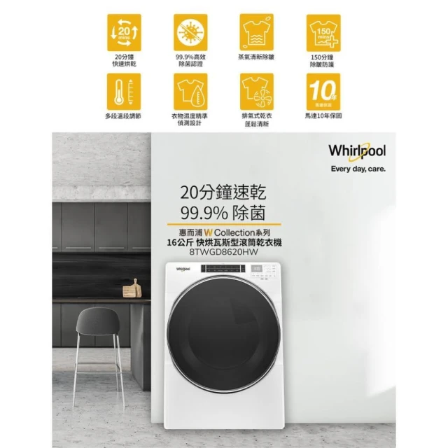 Whirlpool 惠而浦Whirlpool 惠而浦 美國製 17kg 熱洗脫 滾筒式洗衣機 典雅白 8TWFW8620HW(基本安裝)