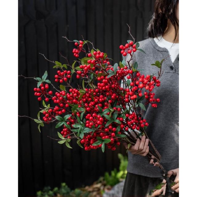 喜可xekoro居家精品 帶葉紅果發財果仿真花擺件冬青漿果樹枝客廳假花擺設乾燥花
