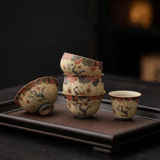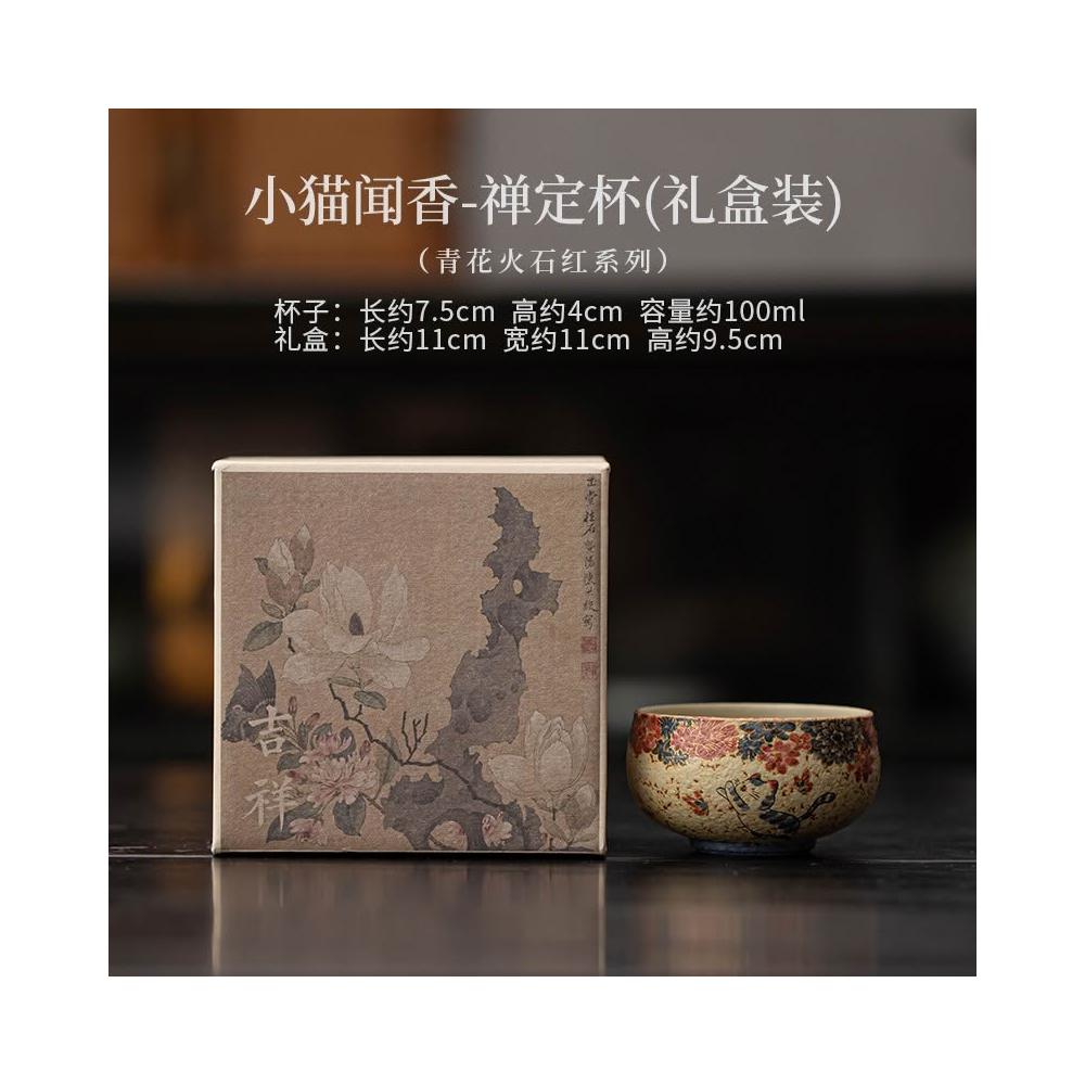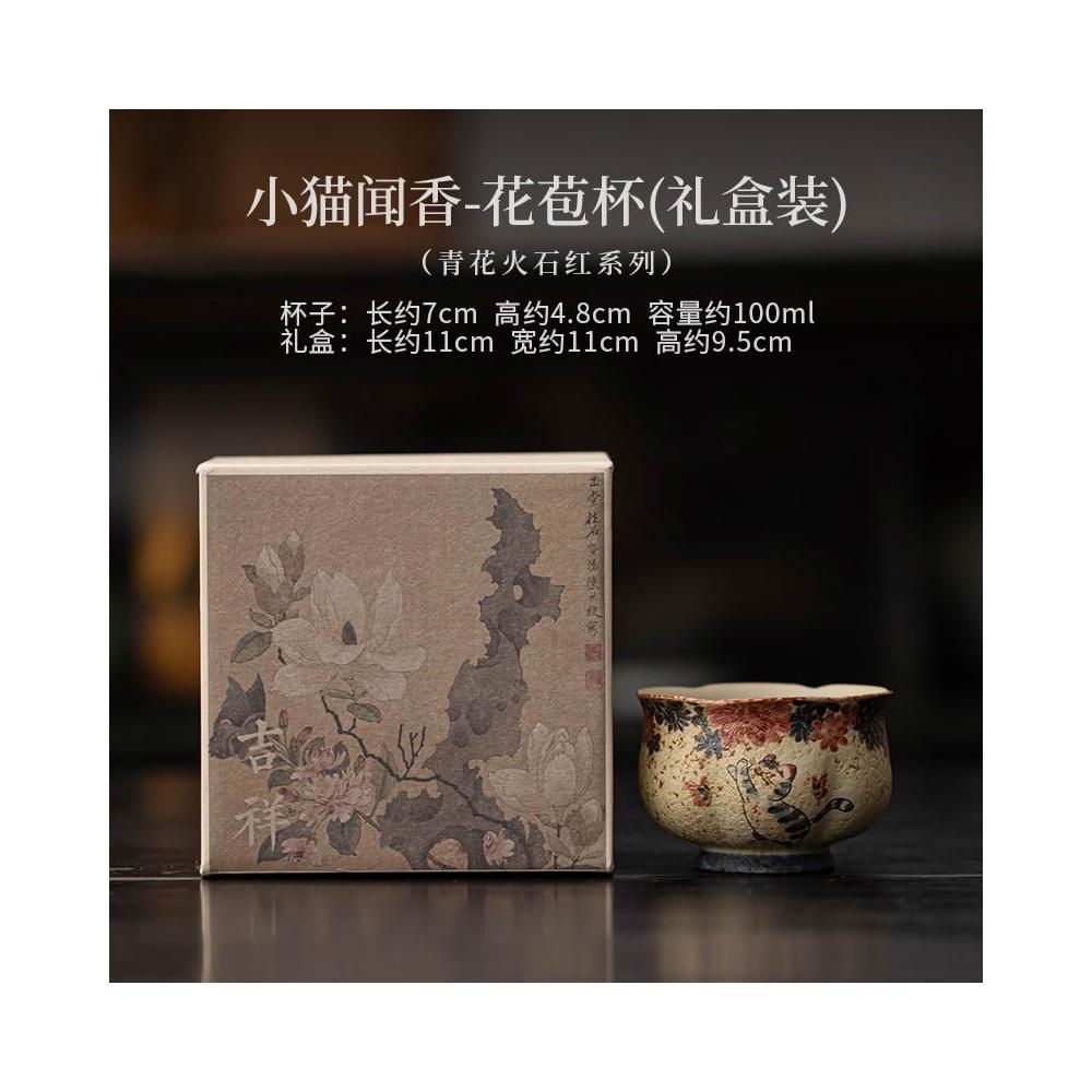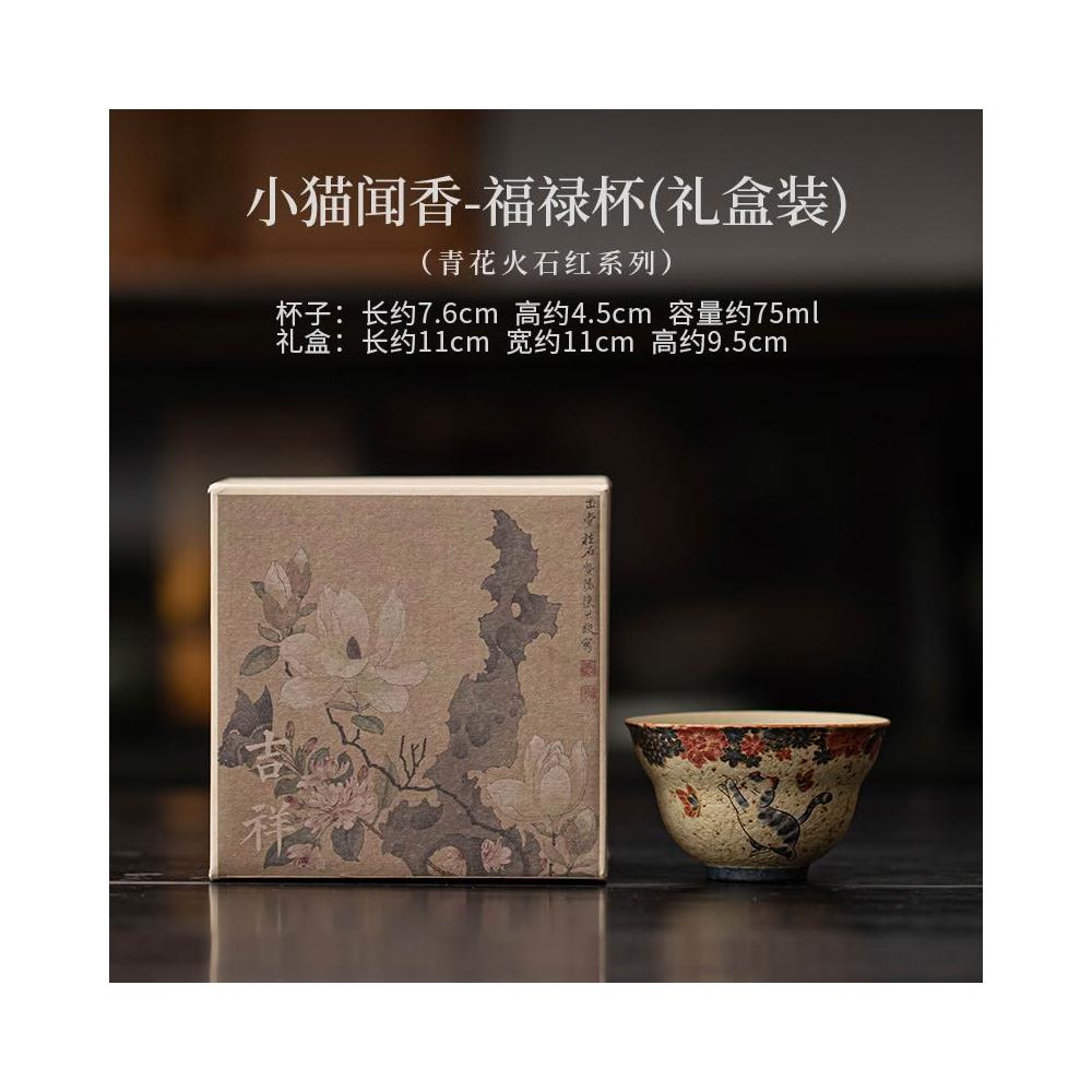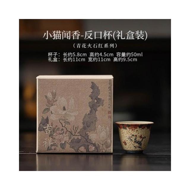 喜可xekoro青花火石紅小貓聞香茶杯陶瓷創意可愛主人杯功夫茶具品茗杯