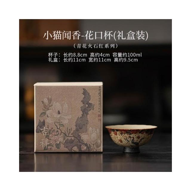 喜可xekoro青花火石紅小貓聞香茶杯陶瓷創意可愛主人杯功夫茶具品茗杯