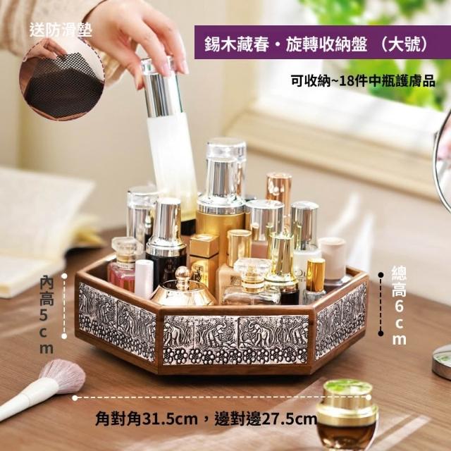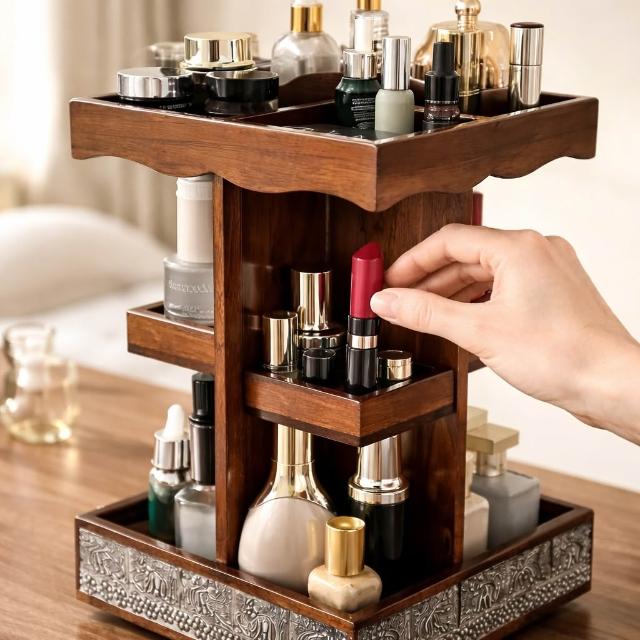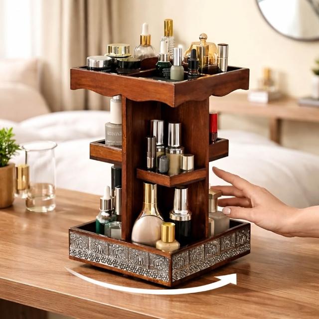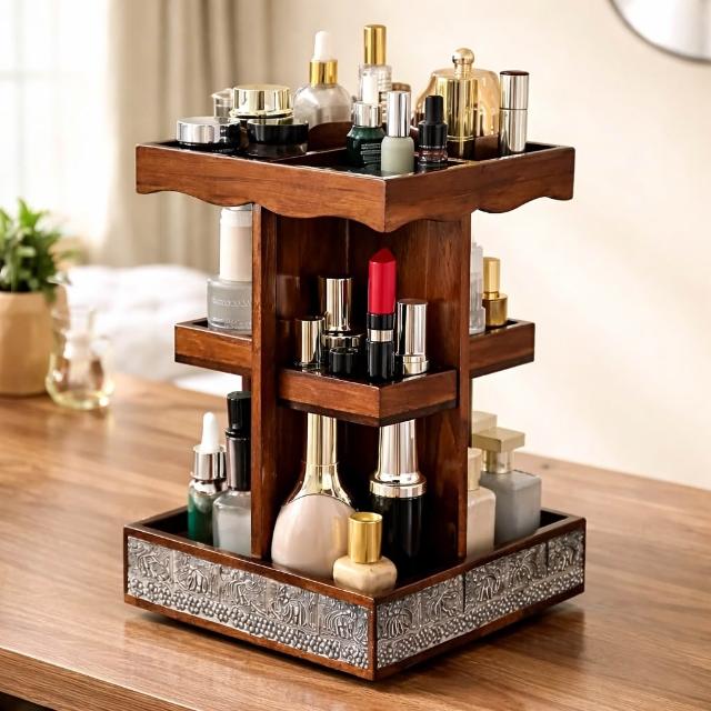 喜可xekoro「全實木三層旋轉化妝品收納架|360°旋轉多層分區整理|高質感木質化妝桌收納」
