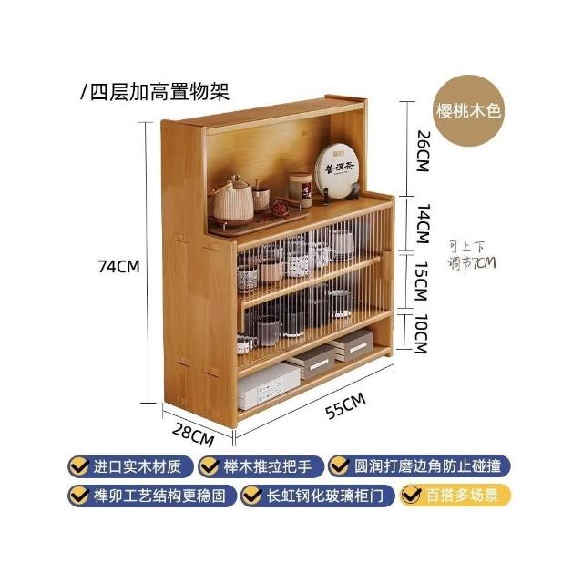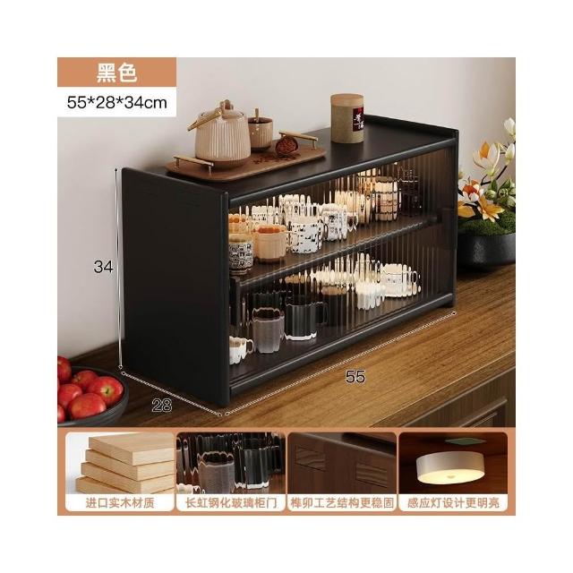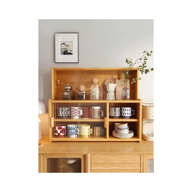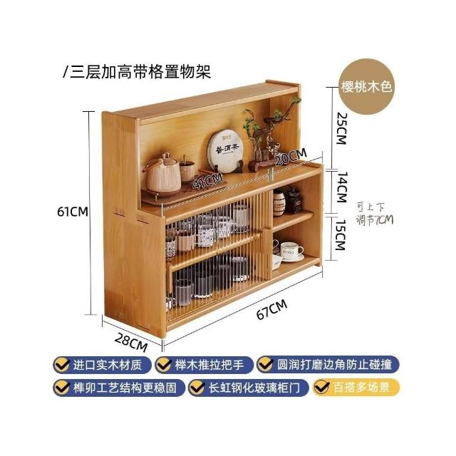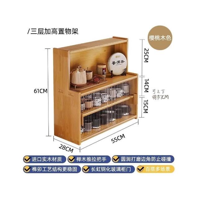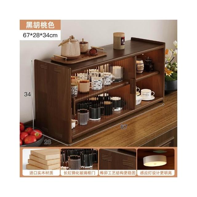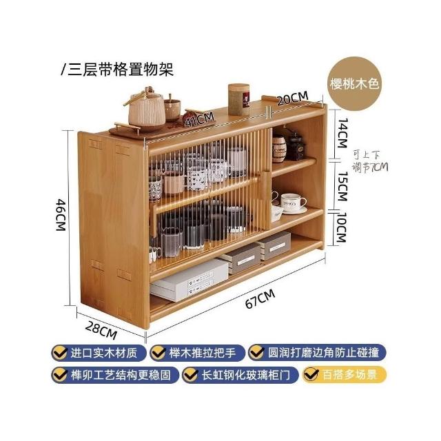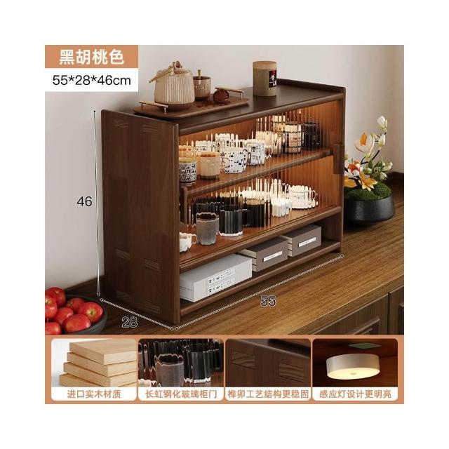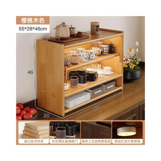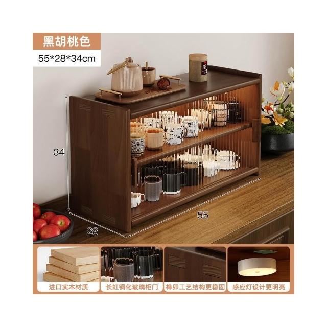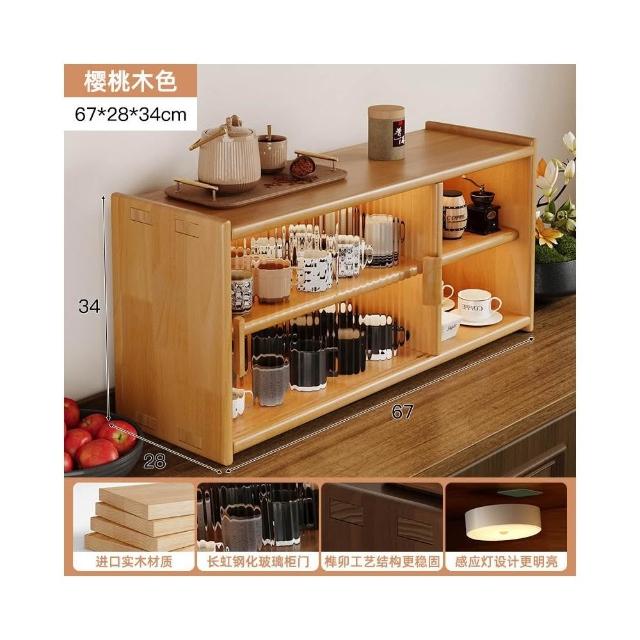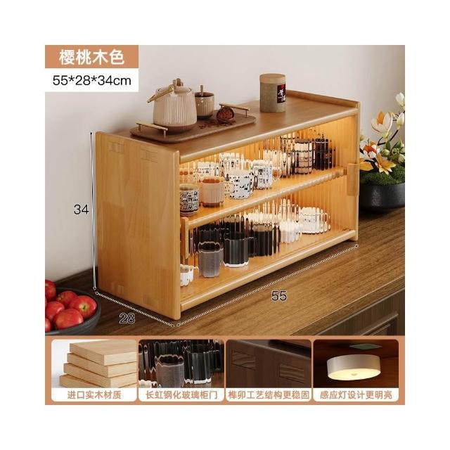 實木桌上收納櫃 防塵置物架 杯架 小型帶玻璃櫃門邊櫃 多層茶具儲物架