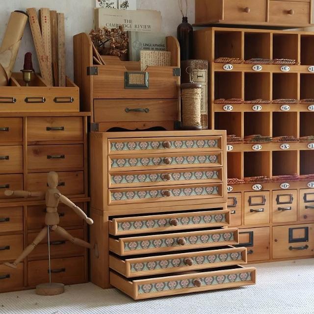 復古木製收納櫃 氛圍感書桌佈置桌面多抽屜印章收納盒 置物架