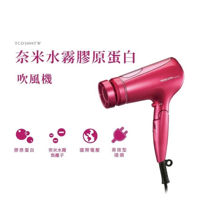 TESCOM大風量速乾負離子美髮白金奈米水霧膠原蛋白吹風機 TCD3000TW 桃紅色 TCD-3000TW