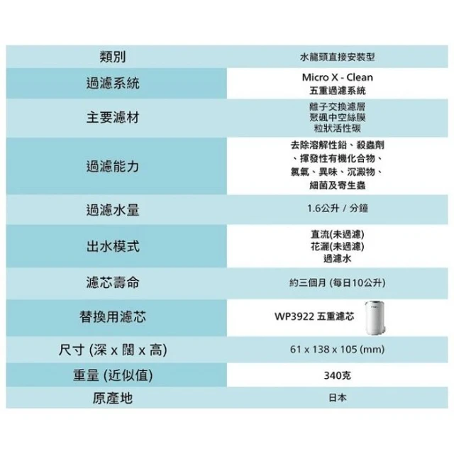 Philips 飛利浦專售店【PHILIPS飛利浦】日本製5重超濾水龍頭濾水器 WP3812 水淨水器過濾器 專用濾心WP3922