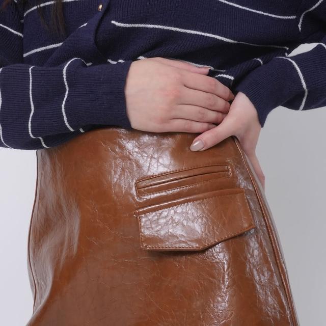 Merite復古紋路裝飾口袋A字皮短裙|棕色 女 短皮裙超軟PU好護理 率性百變穿搭 質感百貨款