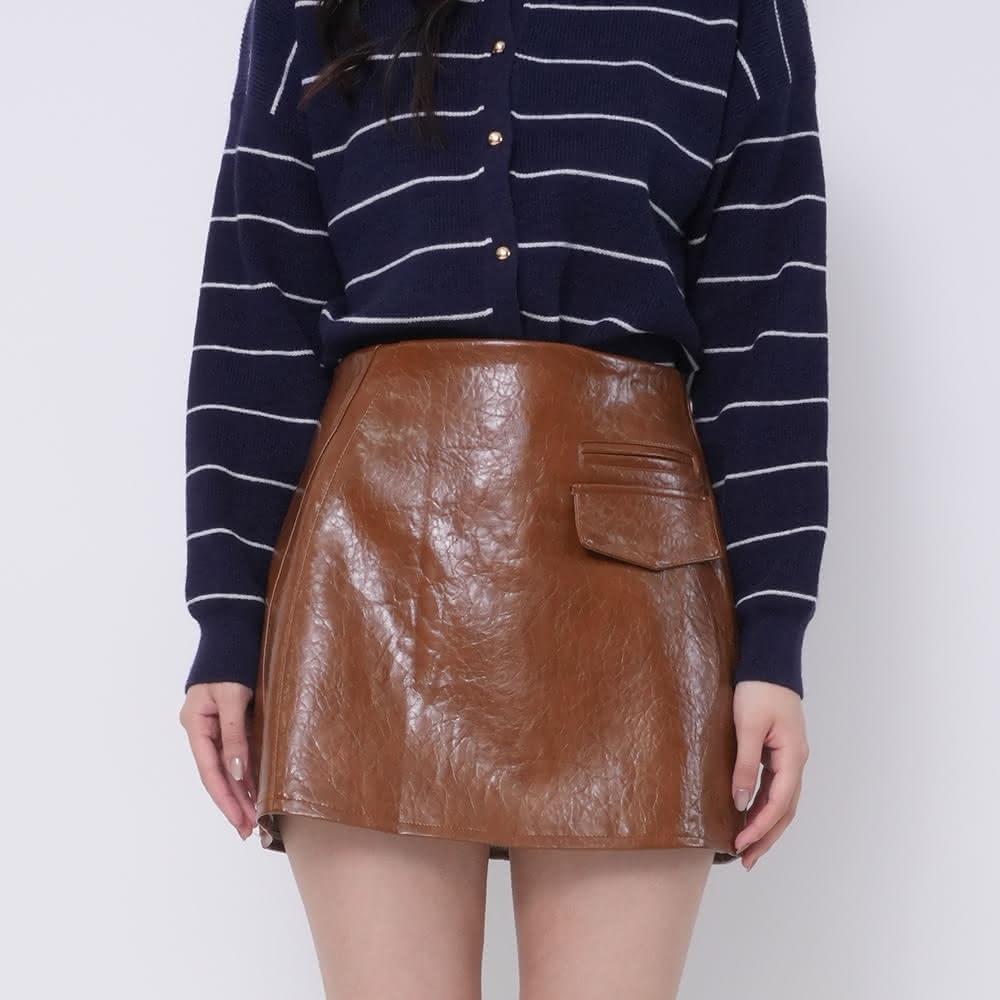 Merite復古紋路裝飾口袋A字皮短裙|棕色 女 短皮裙超軟PU好護理 率性百變穿搭 質感百貨款