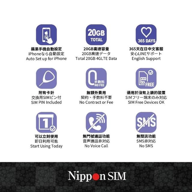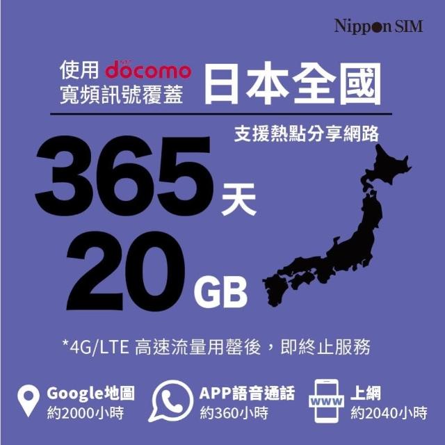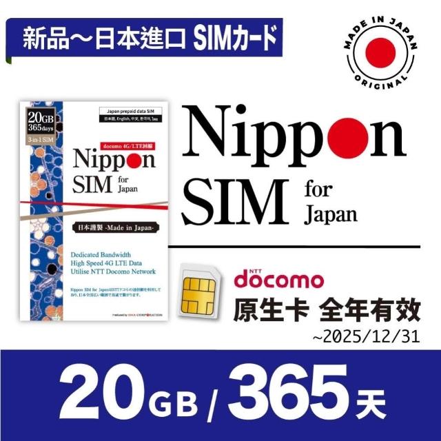 Nippon SIM日本上網SIM卡_20GB/365天🇯🇵日本進口 Docomo 4G/LTE 支援ChatGPT iPhone 三星