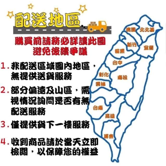 - 針對大型商品(包括:大型家電、家具床墊、健身按摩器材、車類...等),商店將於完成收款確認後,一天內〈不含例假日〉將會有專人與您確認相關配送細節等的聯繫。偏遠地區、樓層費及其它加價費用,皆由商店於約定配送時一併告知,商店將保留出貨與否的權利。