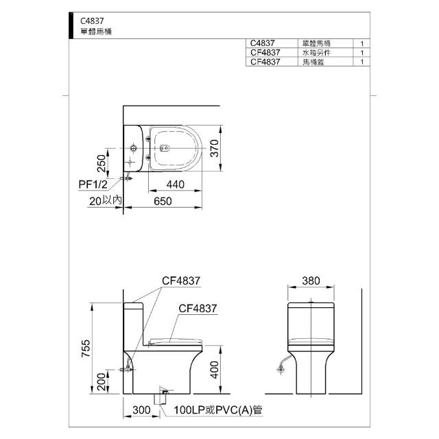 HCG 和成Eton伊頓系列 單體馬桶 上壓兩段式沖水 金級省水 管距300mm (C4837MUT)