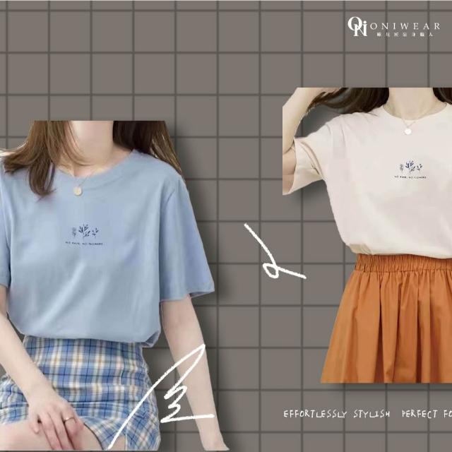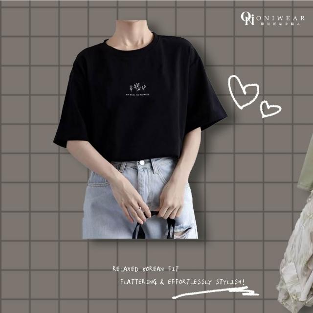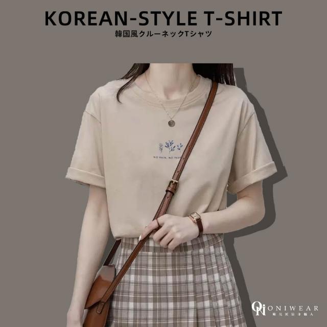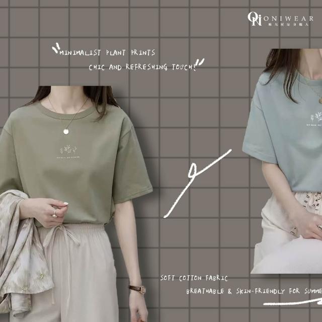 OniWear8色新款 韓版圓領短袖T恤 短袖上衣 夏季女款寬鬆植物印花 休閒純色 打底衫 韓國女裝