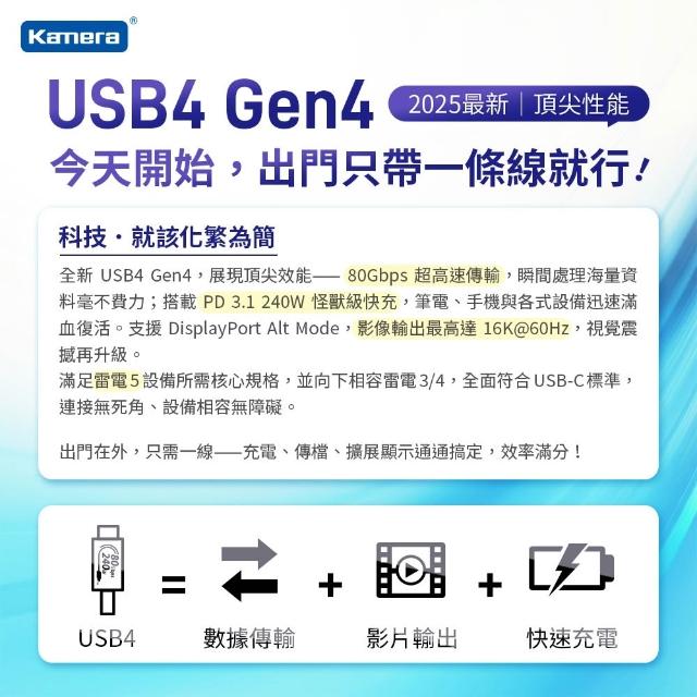 Kamera 佳美能240W 1米 USB4 16K 80Gbps EPR PD3.1 Type-C PD3.1 充電傳輸線