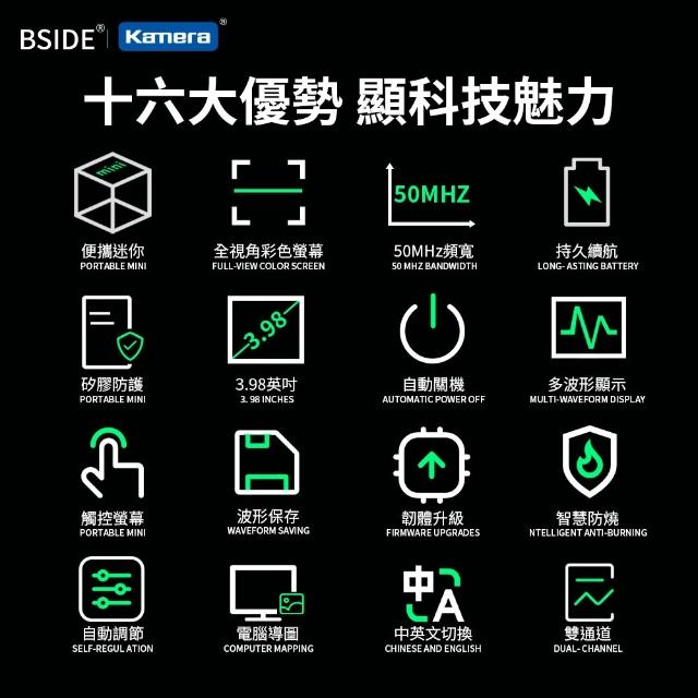 BSIDE 50MHz 雙通道示波器 TFT 帶電阻觸控螢幕 7種訊號波形 智能防燒 支援中文 英文 (O2)