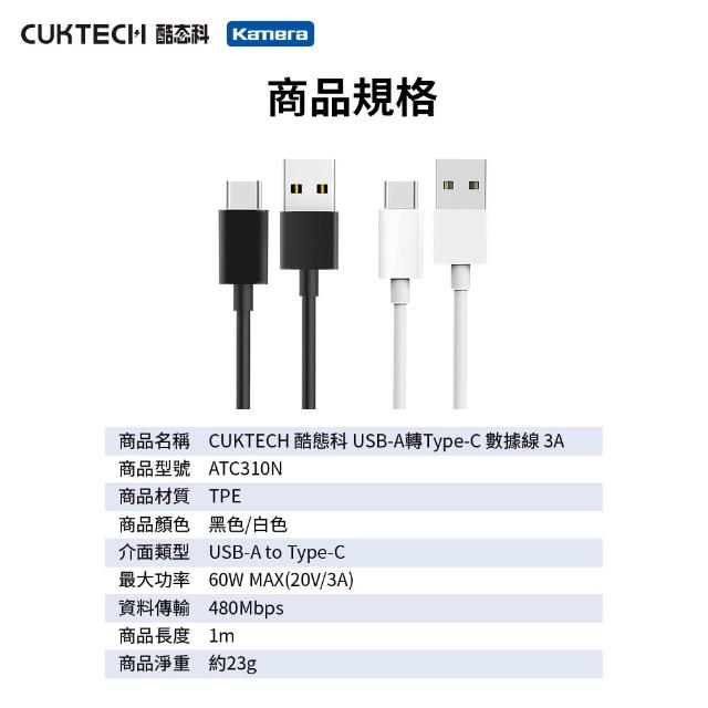 CUKTECH 酷態科60W USB-A 轉 Type-C 3A 充電線 傳輸線 數據線 (ATC310N)