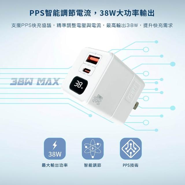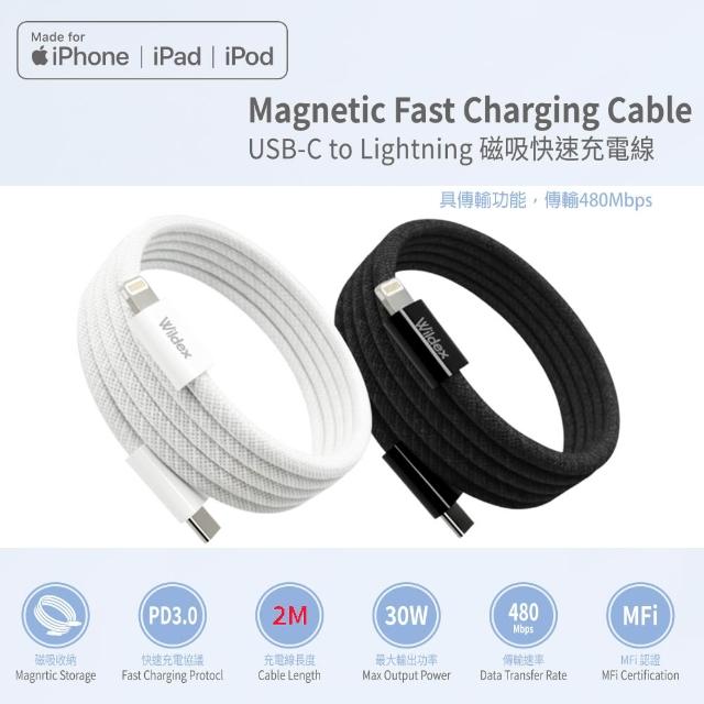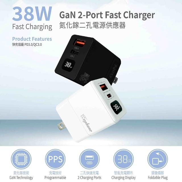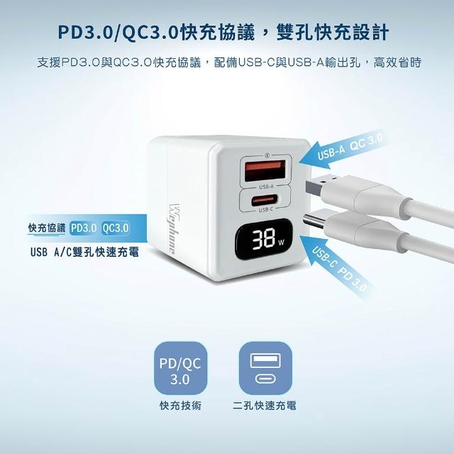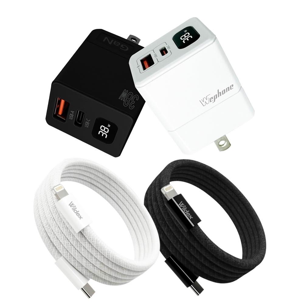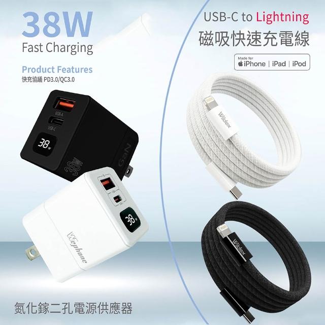 Wephone 38W氮化鎵 數顯雙孔充電器+USB-C to L 磁吸收納快充線(200公分) 【限時免運優惠】