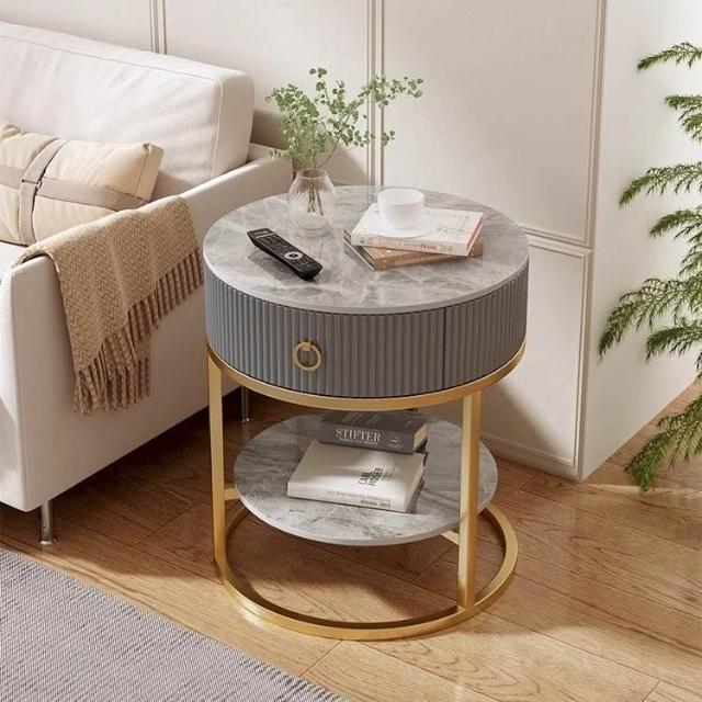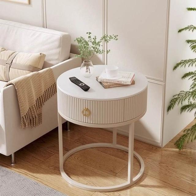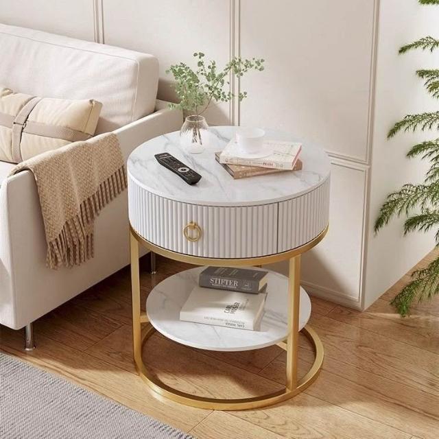 免運 可開發票 奶油風圓形小茶幾客廳傢用沙發巖闆邊幾臥室帶抽屜床頭櫃簡約現代 輕奢儲物櫃 客廳邊角櫃 多功能收納 沙發