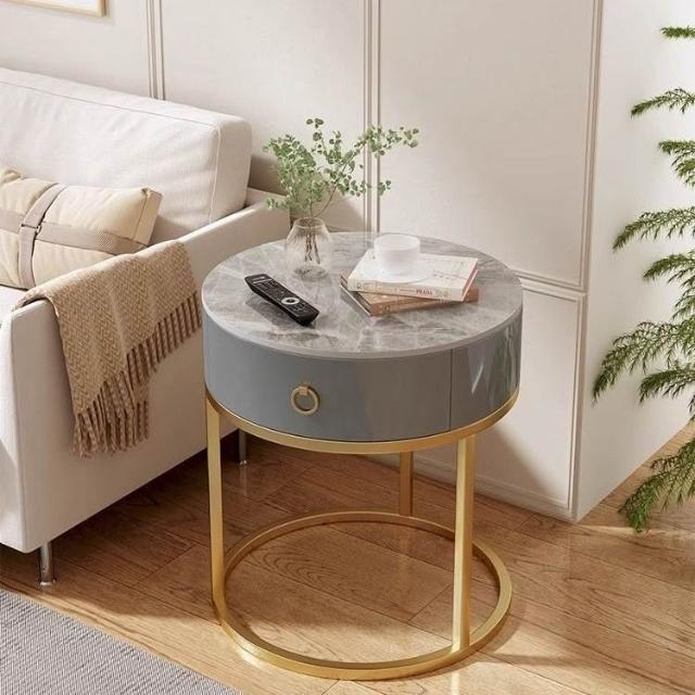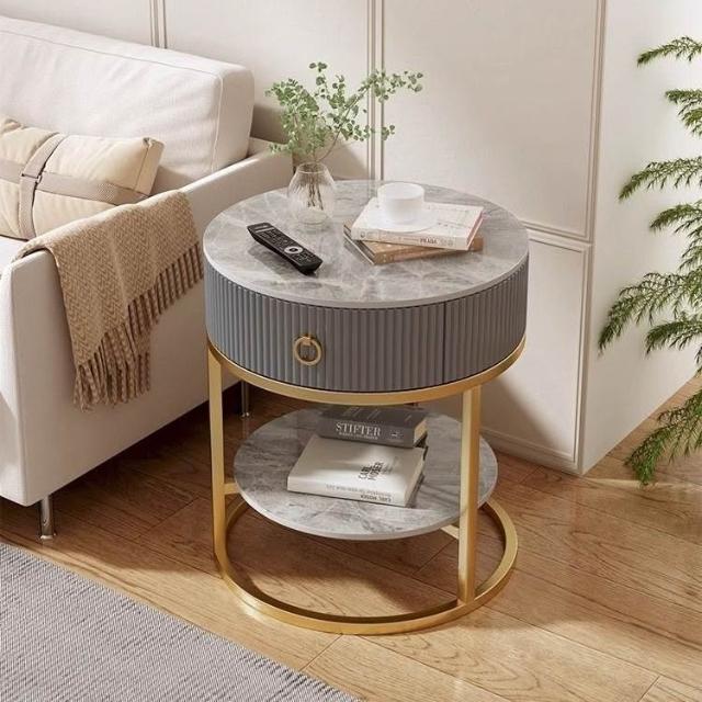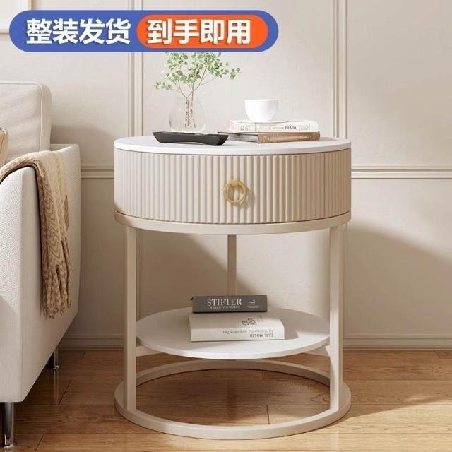 免運 可開發票 奶油風圓形小茶幾客廳傢用沙發巖闆邊幾臥室帶抽屜床頭櫃簡約現代 輕奢儲物櫃 客廳邊角櫃 多功能收納 沙發
