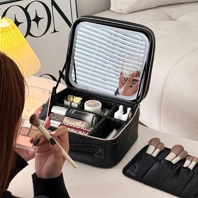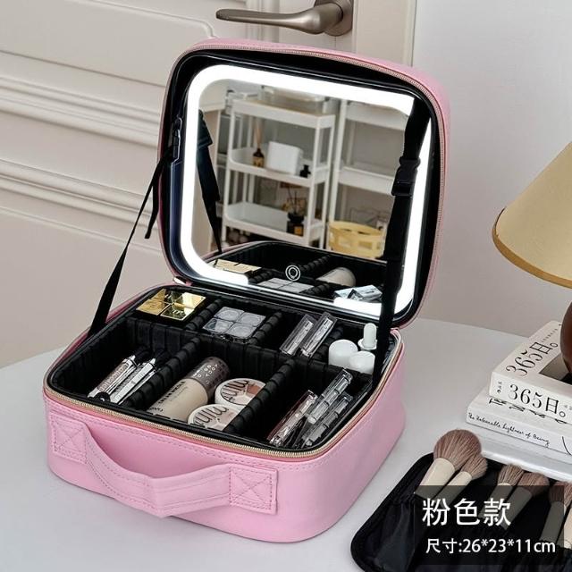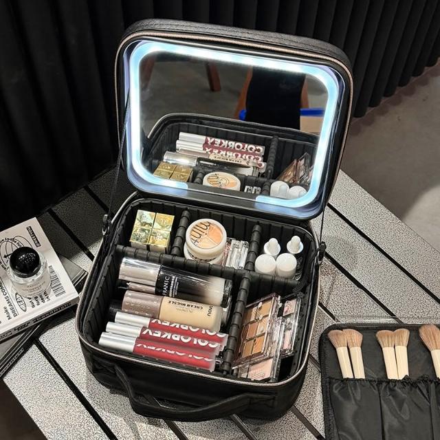 便携式化妆包带镜子一体LED高级手提收纳箱大容量家用旅行化妆镜