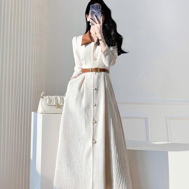 ROCU 若初法式赫本風撞色顯瘦收腰單排釦綁帶POLO領長袖A字裙中長裙連衣裙連身洋裝-米白色-37918M-2XL可選