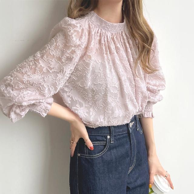 ROCU 若初日系純色半高領泡泡袖長袖雪紡蕾絲襯衫防曬衫上衣女上衣-共5色-37945M-XL可選