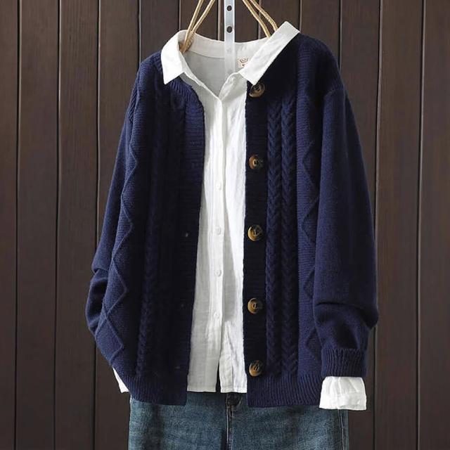 ROCU 若初文藝復古精緻麻花純色休閒寬鬆百搭圓領長袖針織毛衣外套女外套-共5色-38942(F可選)